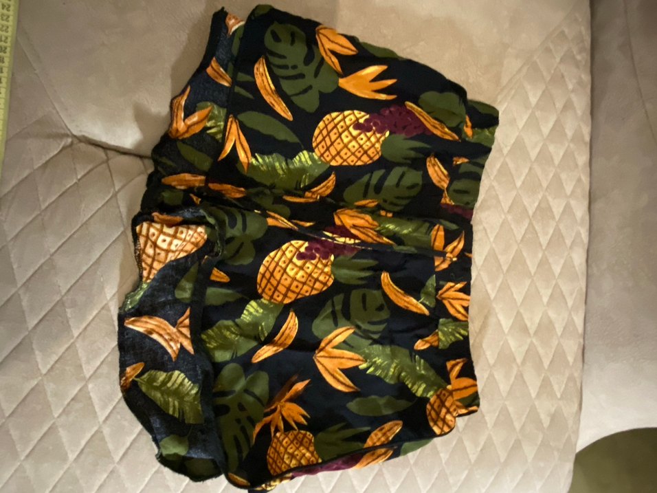 Bohem tarzda, koyu renkli sentetik kumaş üzerine canlı ananas desenli, pileli ve bol kesim mini şort ve üstü. Hiçbir kusuru yoktur yeni gibidir .