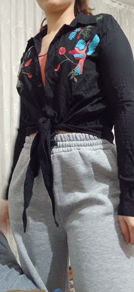 Kadın gömlek , koyu renkli kumaş üzerine canlı çok renkli çiçek ve kuş nakışlarıyla bohem tarzda tasarlanmıştır. Volan detayları bulunur.