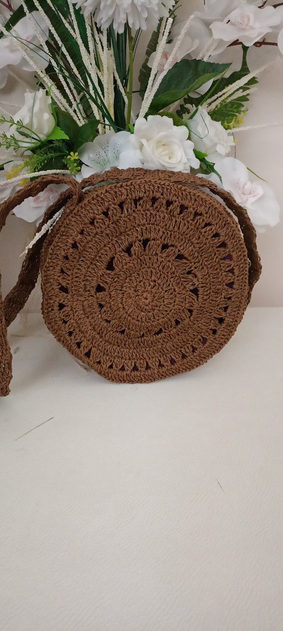 Kahverengi örgü kumaştan yapılmış, renkli nakış ve dantel detaylı, bohem ve retro tarzda kadın çapraz çanta. Günlük kullanıma uygundur.