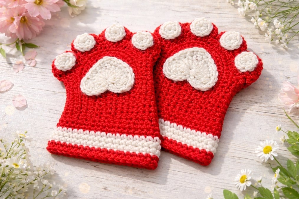 Renkli örgü kadın eldivenleri, beyaz kalp ve pati detayları ile bohem tarzı için sıcak ve rahat bir seçenek sunar.