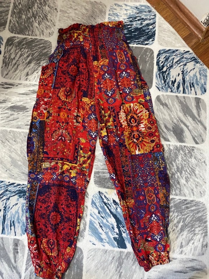 Rahat kesim ve uzun boylu, bohem tarzı örgü kumaştan yapılmış renkli pantolon, günlük kullanım için uygundur.