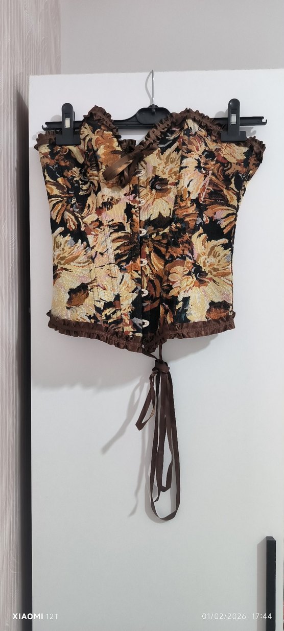 Bu dar kesim bustiyer, straplez yaka, ince askılar ve fırfır detaylara sahip. Kahverengi batik desenli ve midi boyda, günlük kullanım için bohem tarzda.