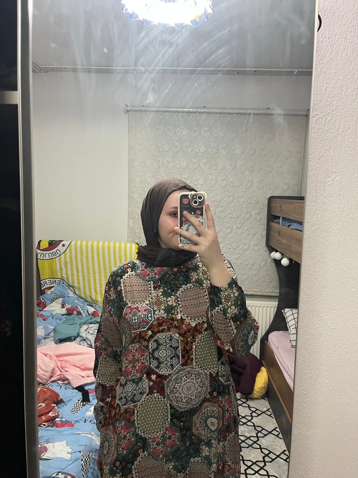 Bu uzun, bol kesim elbise koyu renkli çok desenli kumaştan, uzun kollu, yuvarlak yakalı ve fırfırlı detaylara sahip. Günlük kullanıma uygun bohem tarzını yansıtıyor.