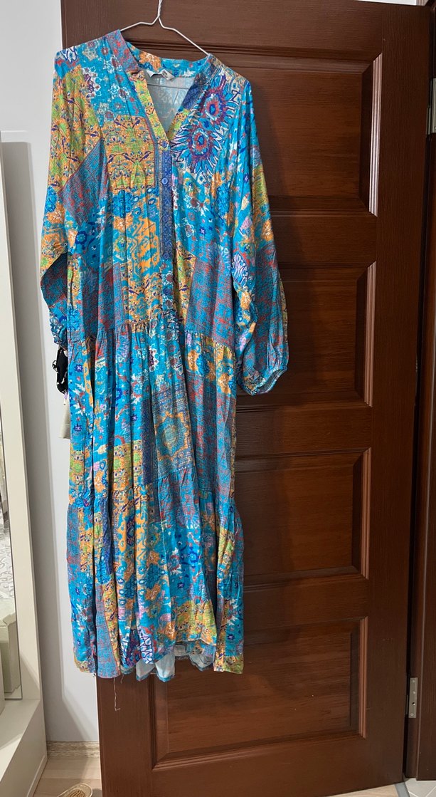 bol kesim, uzun kollu ve renkli uzun elbisesi, drapeli ve canlı tie-dye desenlidir. İki kol arası 52 cm