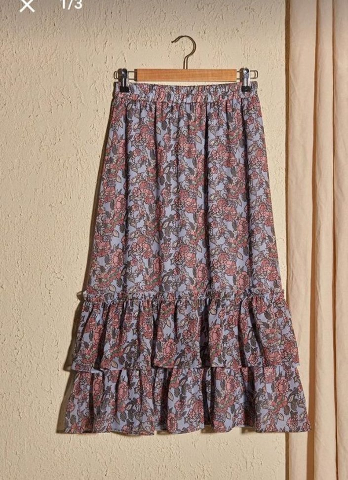 Gri ve kahverengi tonlarda, yumuşak tekstil kumaştan yapılmış, bol kesim ve fırfır detaylı bohem desenli uzun kadın eteği.