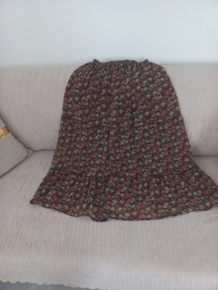 Sentetik kumaştan yapılmış, kahverengi, bol kesim, fırfırlı ve batik desenli uzun bohem tarzı kadın eteği. Günlük kullanıma uygundur.