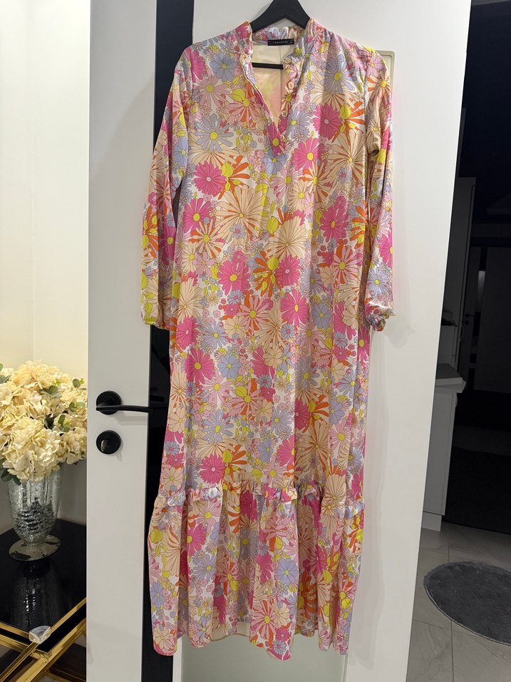 Pastel renklerde cıvıl cıvıl çiçek desenli, uzun kollu, hakim yakalı, bol kesim ve fırfır detaylı bohem elbise.