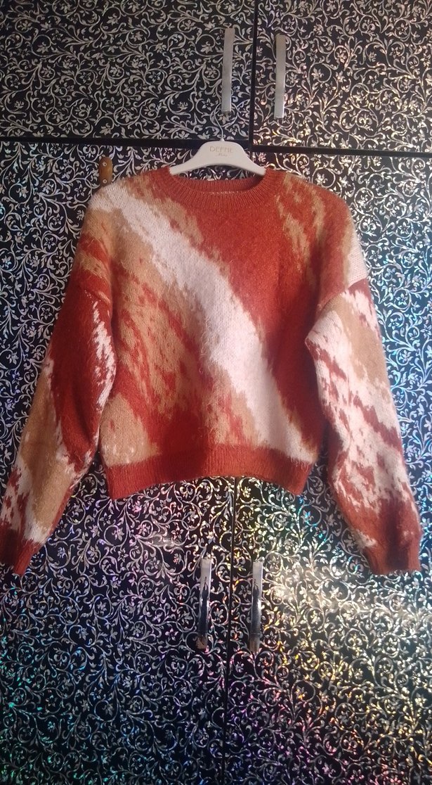 Yumuşak triko kumaştan, bol kesim ve uzun kollu, bohem tarzda, pastel kahverengi tie-dye desenli kadın kazak.