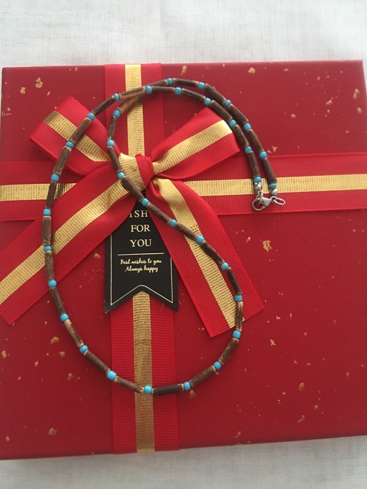 Turkuaz ve kahverengi boncuklarla renkli bohem tarzı uzun kolye, baskılı kurdele detaylı. Romantik buluşmalar için uygun bir parça. Hindistan cevizi kabuğu boncuk kolye 50 cm ölcüsü