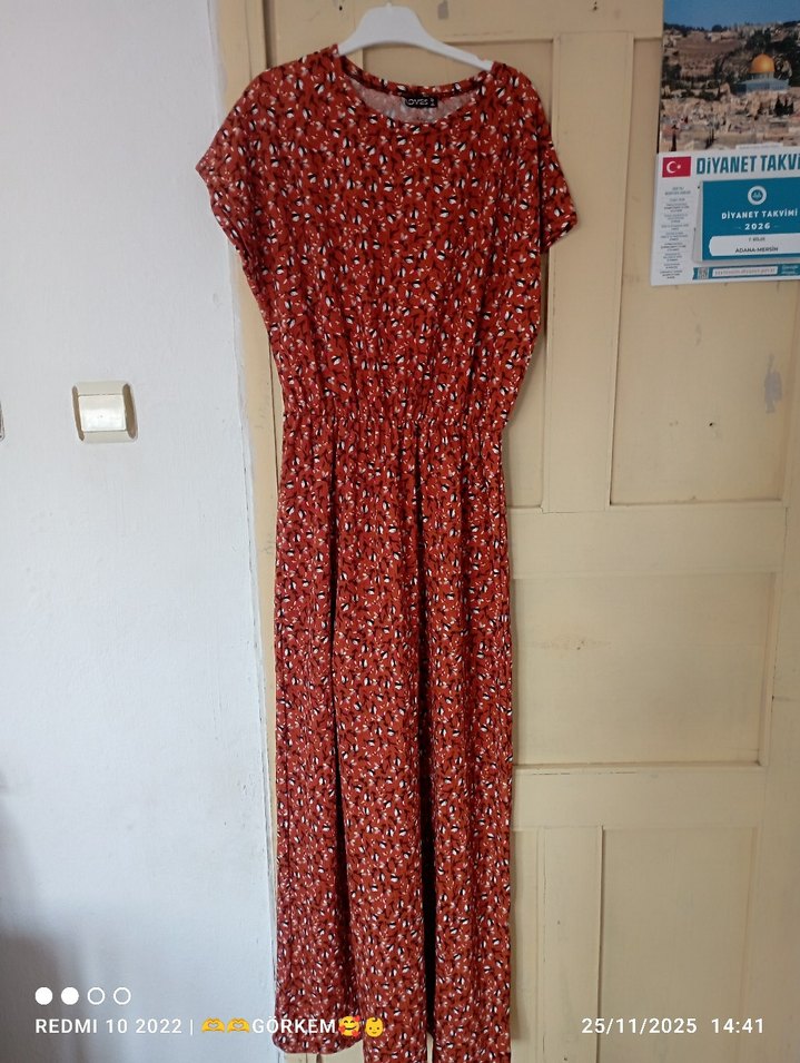 Renkli tie-dye desenli, kısa kollu, yuvarlak yakalı, bohem tarzda uzun ve salaş elbise. Sentetik kumaştan, günlük kullanım için uygun.