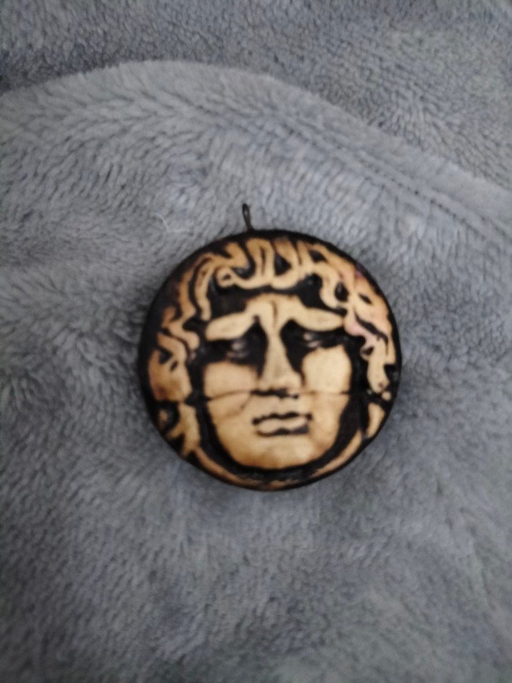 Bu erkek broş, kahverengi retro tasarıma sahip olup stilize bir yüz figürü içerir. Bohem ve grunge punk etkileri taşır, karşı kültür modasına uygundur.