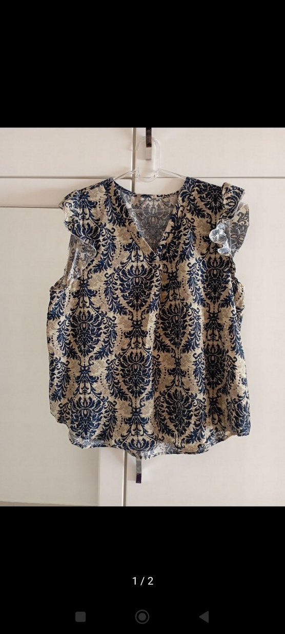 Kolsuz, bol kesim ve V yaka kadın bluz, vintage esintili mavi ve gri baskılı desen ile volan detaylara sahiptir. Bohem tarz için uygun.