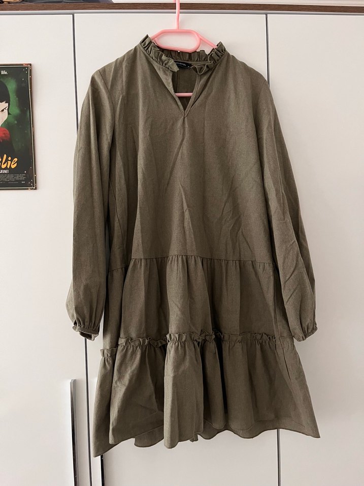 Nefes alabilen keten kumaştan, bol kesim mini elbise. Uzun kollu, fırfırlı yüksek yakalı, haki renkte. Trendy gündelik şıklık için ideal.