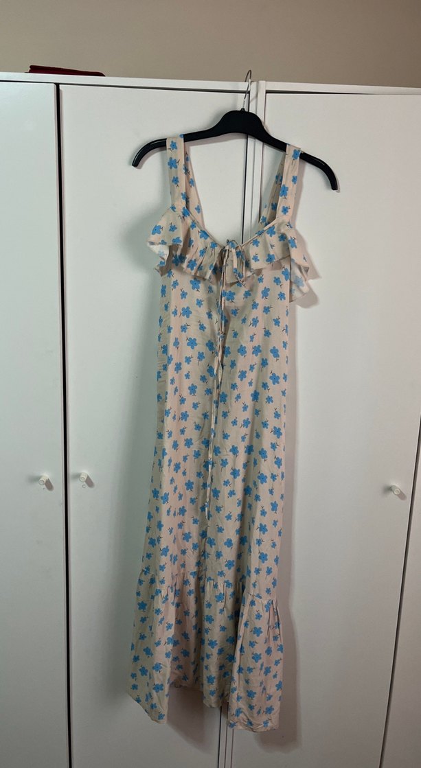 Halter yakalı, fırfırlı uzun, bol kesim elbise. Yumuşak sentetik kumaştan, pastel bej zemin üzerine mavi çiçek desenli. Günlük kullanıma uygun.