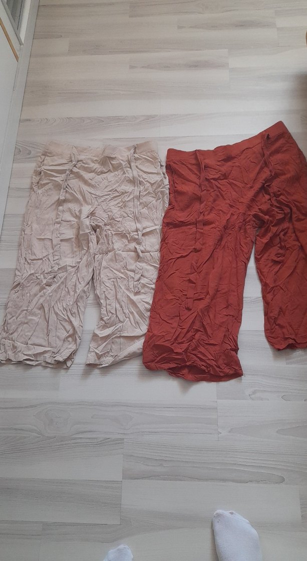 Bej ve kiremit renklerinde, keten kumaştan, bohem tarzda, salaş ve drapeli midi pantolonlar. Rahat ve günlük kullanım için uygundur.