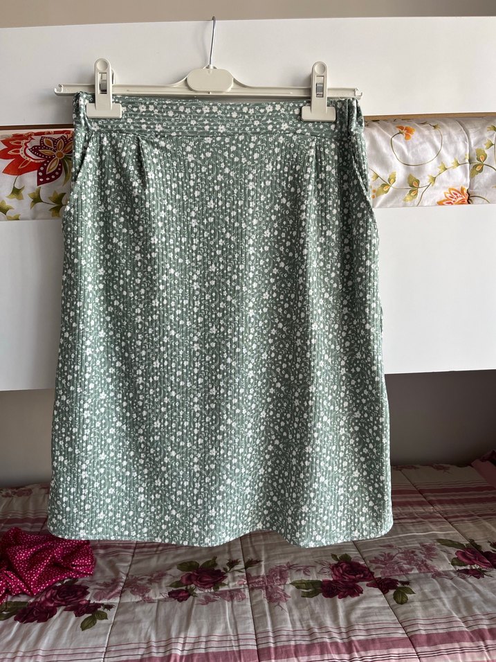 Yeşil tekstil kumaştan, bohem tarzda, salaş kesim mini hamile eteği, drapeli detaylı, günlük kullanıma uygun.