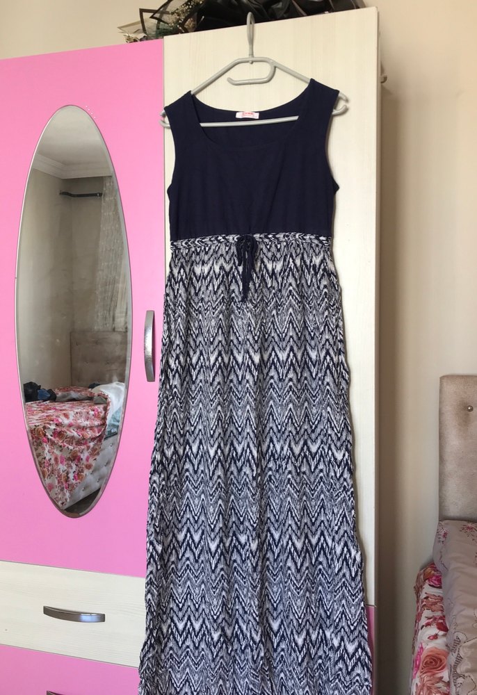 Mavi ve gri tonlarda, pamuklu, pileli kumaştan, salaş kesim, kolsuz ve straplez uzun elbise. Bohem tarzda batik desenli. M-L uyumlu