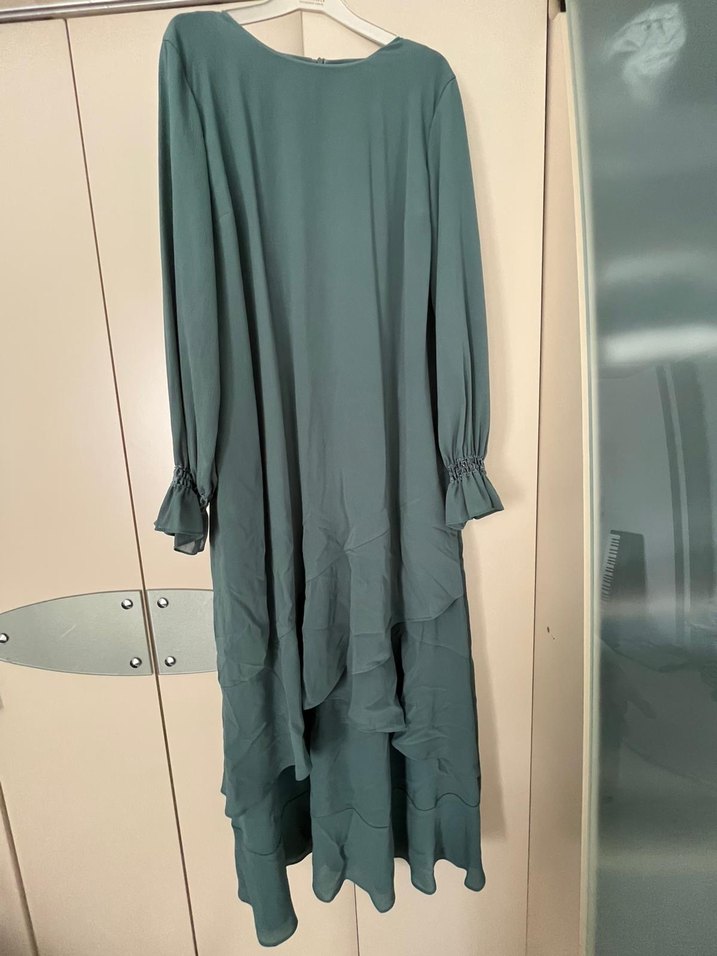 Yeşil bohem tarzı uzun elbise, salaş kesim ve drapeli detaylara sahiptir. Uzun kollu, yuvarlak yakalı ve yumuşak sentetik kumaştan üretilmiştir. 1 kez giyildi sıkıntısı yoktur