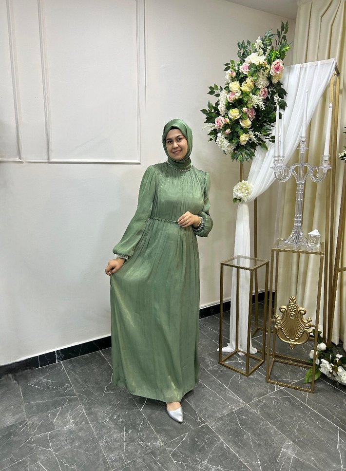 Bohem tarzı, salaş kesim, yüksek yakalı ve uzun kollu, hafif batik desenli uzun haki kadın elbisesi. sal ile beraber gönderilecektir sorunu yoktur 100 kiloya kadar olur giyen kişi 1.74 boyunda