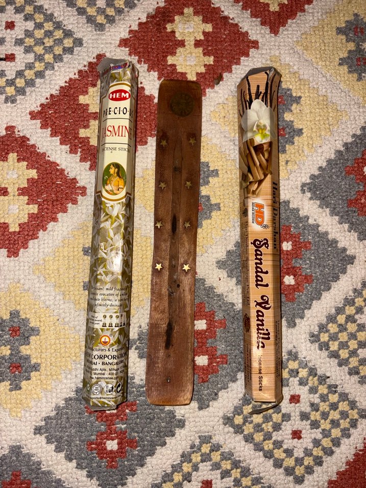 Bohem tarzda, yıldız desenli ahşap sandal tütsülük ve Yasemin ile Sandal Vanilya tütsü paketleri içerir. Yaseminden 12 vanilyadan 15 tane vardier. Kokulari gercekten cok guzel.