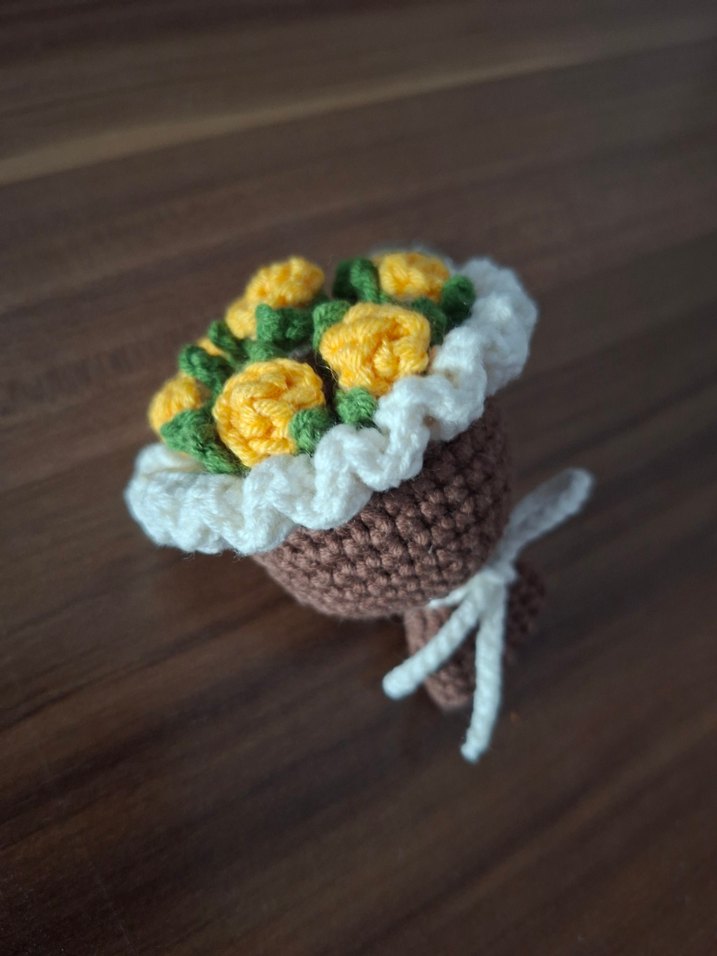 Sarı çiçekler ve yeşil yapraklarla el yapımı örgü buket, kahverengi taban ve beyaz fırfır detaylı, beyaz ip ile bağlanmıştır.