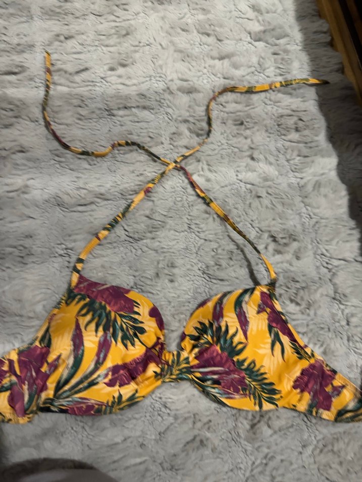 Fitted kesim, bağcıklı askılı, sarı ve mor tropikal desenli bohem bikini üstü, plaj için uygun.