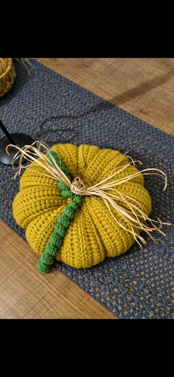 Kalın sarı ve yeşil iplikle el örgüsü bohem tarzda kabak dekoru, doğal rafya fiyonk ile süslenmiştir.