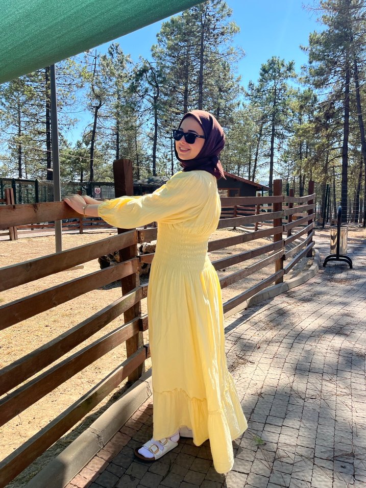 Yüksek yakalı, uzun kollu, bol kesim sarı uzun elbise. Pamuklu kumaş, drapeli ve batik desenli, bohem tarz için ideal.
