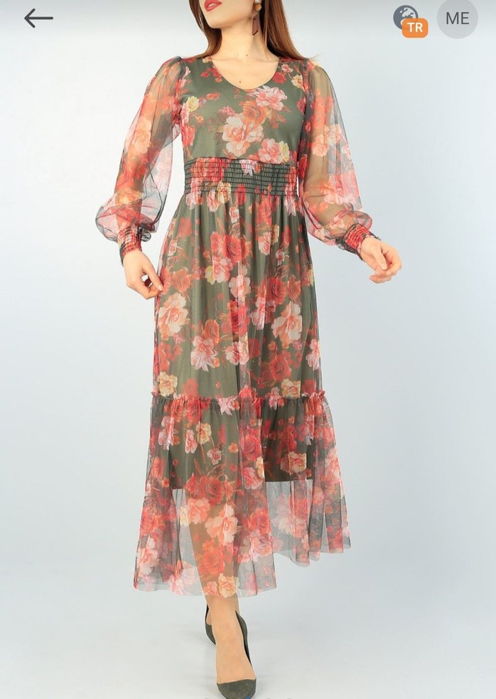 Bohem tarzda, V yaka ve uzun şeffaf kollu, renkli çiçek desenli uzun elbise. Yumuşak sentetik kumaştan, bol kesim, günlük kullanım için uygun.