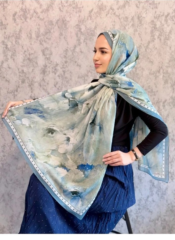 Sentetik kumaştan, mavi ve gri bohem desenli, drapeli kadın şalı. Mütevazı ve zarif bir görünüm sunar.