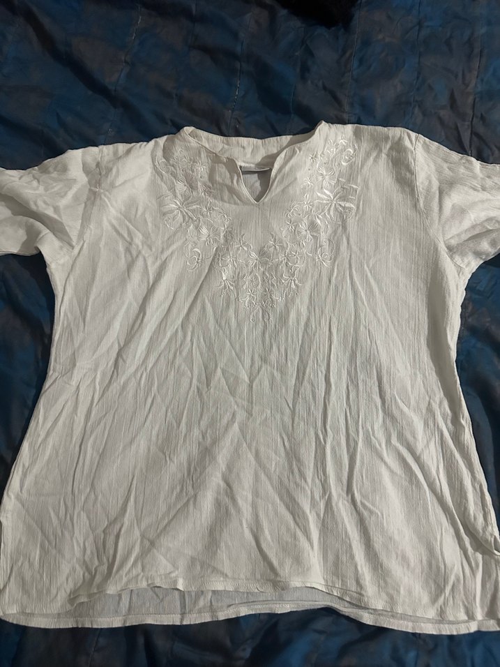 Yumuşak keten şile bezi kumaştan, kısa kollu ve V yakalı beyaz kadın bluz. Bohem tarzda, yakada ince nakış detaylarıyla günlük kullanım için uygun. Boyu 60 cm koltukaltı 54 cm