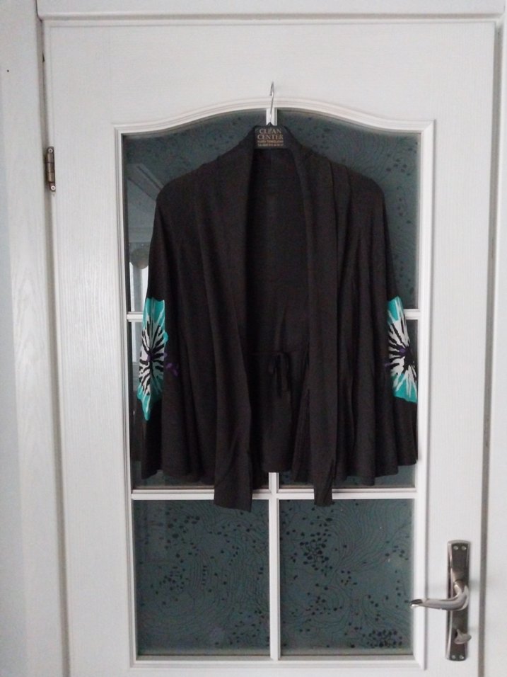 füme 36-40 yarasa fakir kollu kollarında batik desen detaylı, salaş kesim ve drapeli bohem tarzda kadın hırka. Midi boyda, straplez yaka ile günlük kullanıma uygun.sağ omuzda biraz renk açilma var askıda durmaktan çok az beli olmiyor (gorselde).