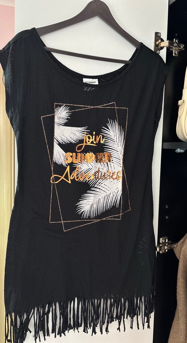Kısa kollu, V yakalı siyah Bohem baskılı, bol kesim ve normal boyda, sentetik kumaştan. Günlük kullanıma uygun.