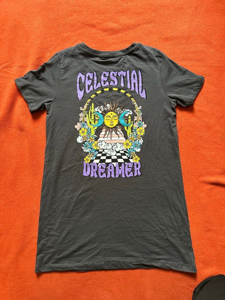 Siyah, baskılı, kısa kollu hamile tişörtü. Sentetik kumaştan, rahat kesimli ve yuvarlak yakalı. Dış mekan için uygun, zahmetsiz şıklık sunar.
