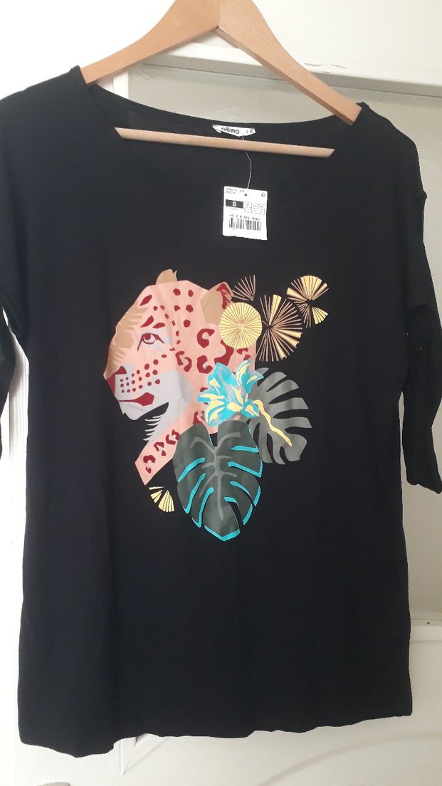 Siyah renkli, kısa kollu, yuvarlak yaka, omuz detaylı bol kesim tişört. Canlı baskılı ve penye kumaştan, günlük kullanıma uygun bohem tarzda.