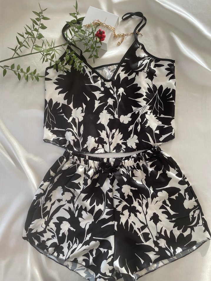 Bohem tarzda, siyah beyaz çiçek desenli, askılı üst ve şortlu, bol kesim kısa pijama takımı. Farklı bedenleri var ve 1 beden büyük alınız
