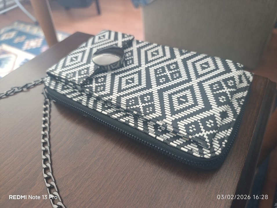 Bohem tarzda, fermuarlı, siyah beyaz baskılı sentetik kumaştan yapılmış günlük kullanıma uygun kadın çanta cüzdanı.