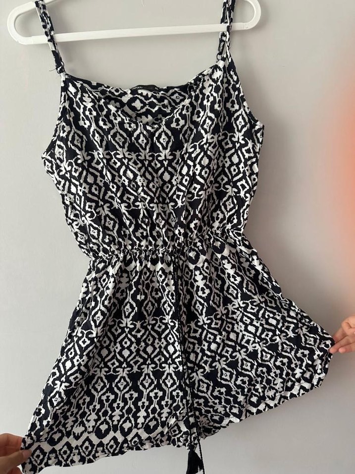 Bohem tarzda, siyah beyaz desenli, askılı ve V yaka kısa tulum. Kemer detaylı ve bol kesim, rahat bir kullanım sunar.