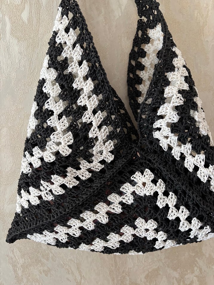 Bohem tarzda, siyah-beyaz desenli, dantelli örgü kadın çantası, günlük kullanıma uygun rahat bir modeldir.
