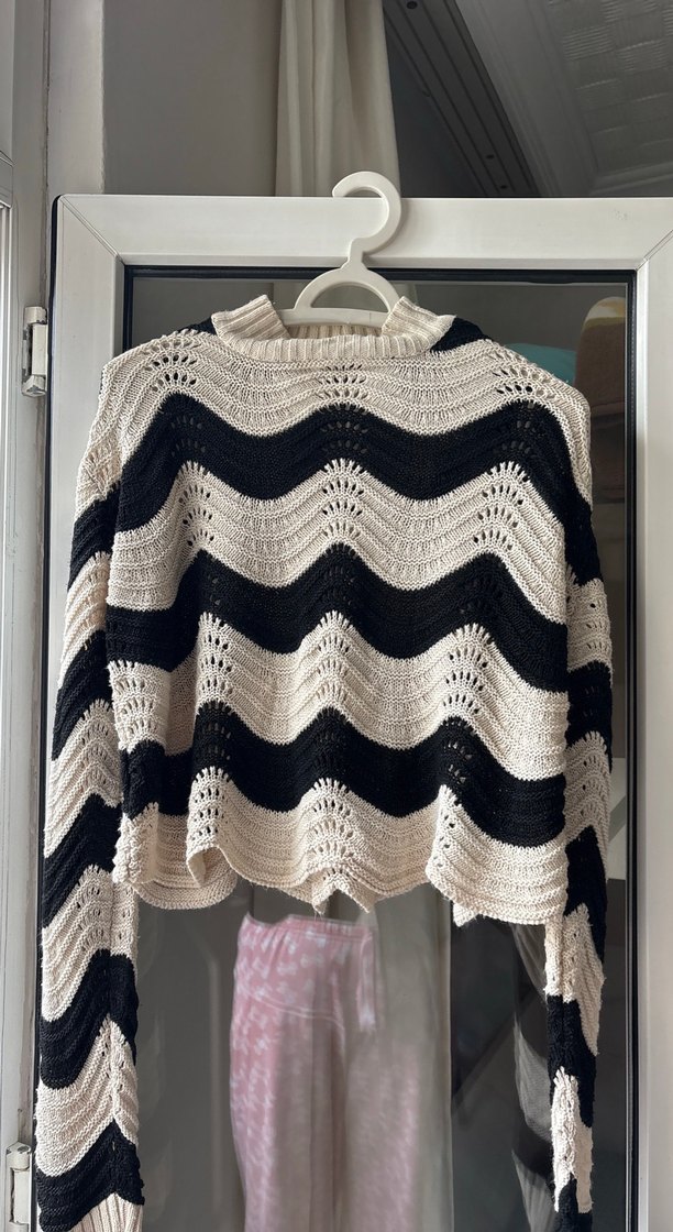 Örgü kumaştan, bol kesim uzun kollu ve yüksek yakalı siyah beyaz dalgalı desenli bohem tarz kazak. Rahat ve günlük kullanım için ideal.