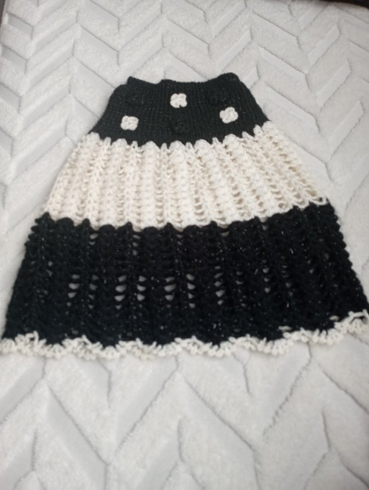 Geniş kesim, siyah beyaz renklerde, örgü dokulu bohem ve retro tarzda kız eteği.