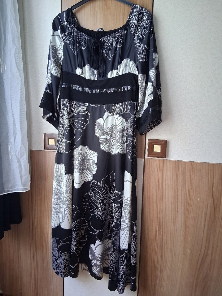 Bohem tarzda, siyah beyaz çiçek desenli, uzun ve bol kesim gece elbisesi. Drapeli, askılı ve kare yakalıdır. Boyu 135 cm 38. 40. ve 42 bedene rahatlıkla olur kumaşı saten bel ve kol uçlarında şerit payet var üstte çok şık duruyor