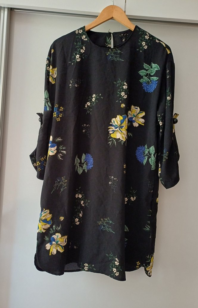 Siyah zemin üzerine koyu renk çiçek desenli, dirsekte kolu, bol kesim ve drapeli . Midi boy ve yuvarlak yaka Elbise..