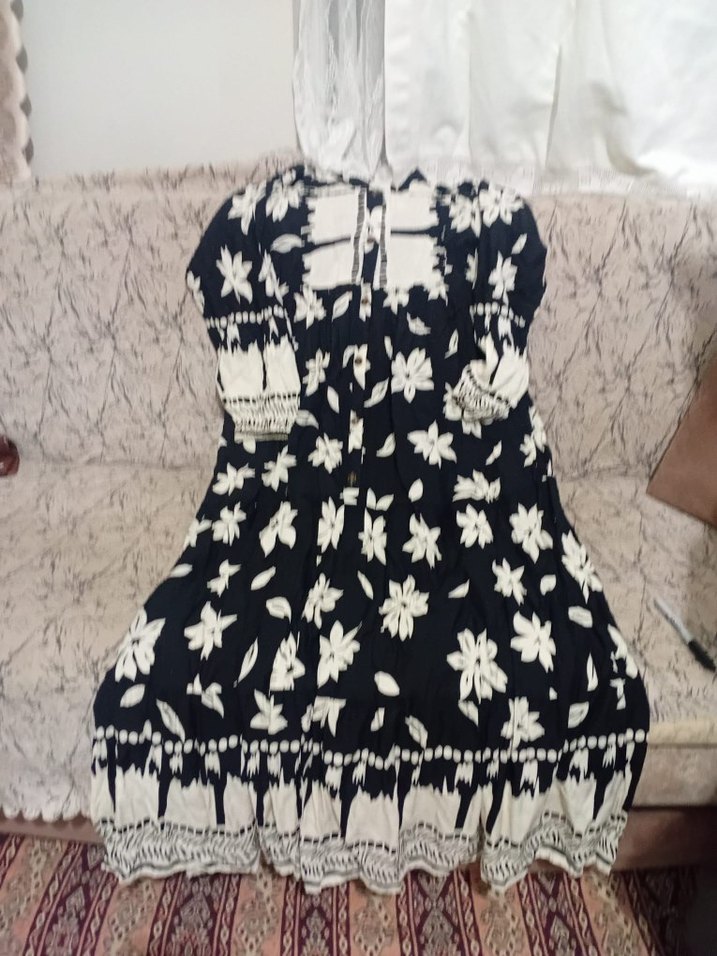 Siyah zemin üzerine beyaz çiçek desenli, bol kesim uzun elbise. Kolsuz ve askısız, fırfır detaylı bohem tarzda. boy 134 eni54