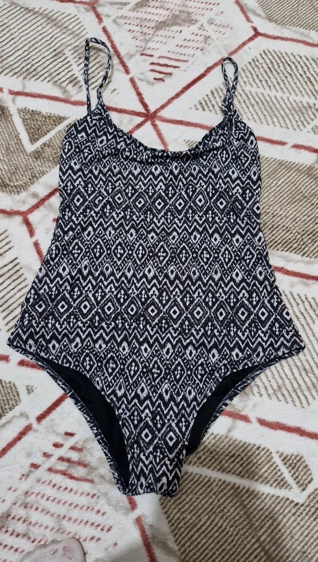 Bohem tarzda, siyah beyaz geometrik desenli, ip askılı ve örgü dokulu, normal boy mayo. Plaj için uygun. ️
