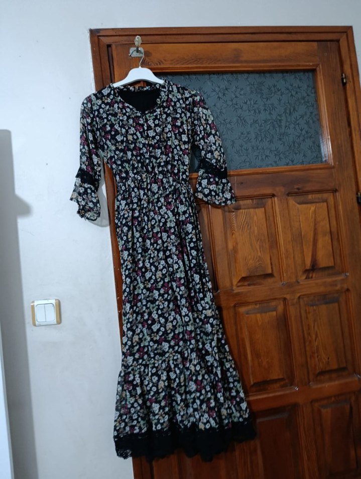 Siyah mini elbise bol kesim ve fırfır detaylıdır. kisa, V yaka ve koyu renkli batik desenlidir. Günlük kullanıma uygundur.