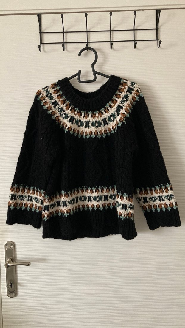 Bohem tarzda, yuvarlak yaka ve bol kesime sahip, desenli örgü kumaştan günlük kullanıma uygun kadın kazak.