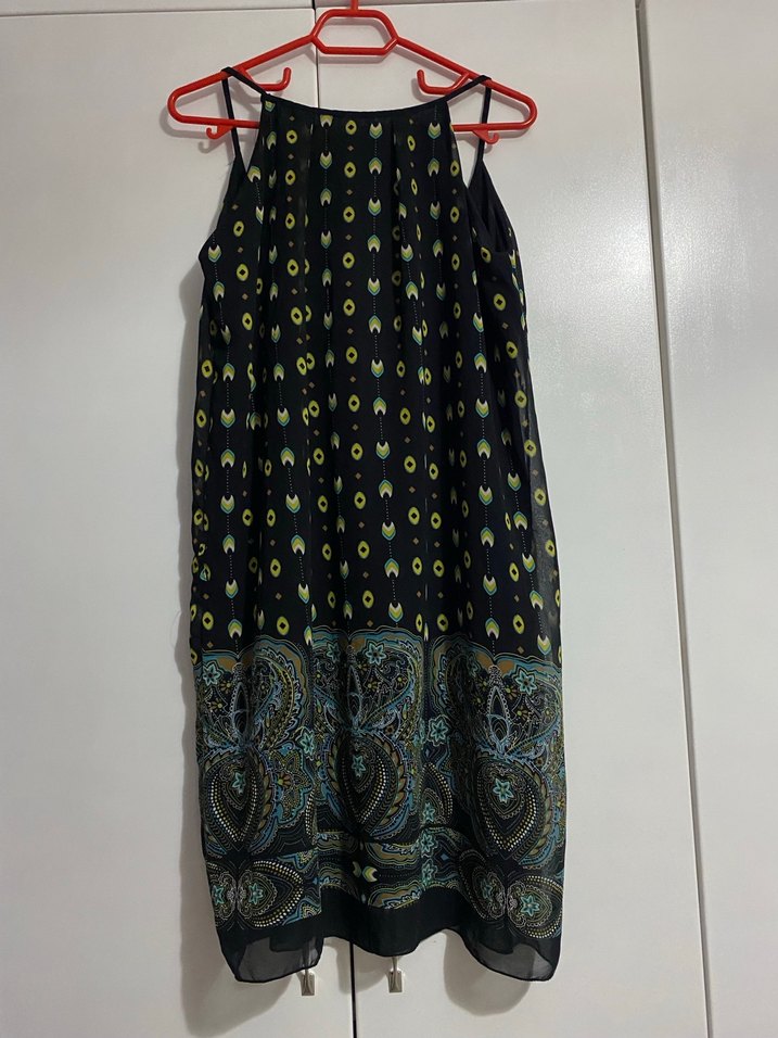 Askılı, straplez yaka ve bol kesim siyah elbise. Çok renkli bohem desenli, dökümlü şifon kumaştan yapılmıştır. Günlük kullanıma uygundur. Hiç giyilmedi temiz