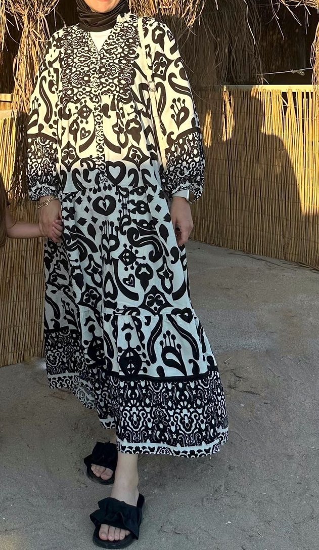 Bol kesim, uzun kollu ve drapeli bu elbise, V yaka tasarıma sahiptir. Siyah-beyaz desenli tekstilden yapılmış, günlük kullanıma uygun bohem tarzda bir üründür.