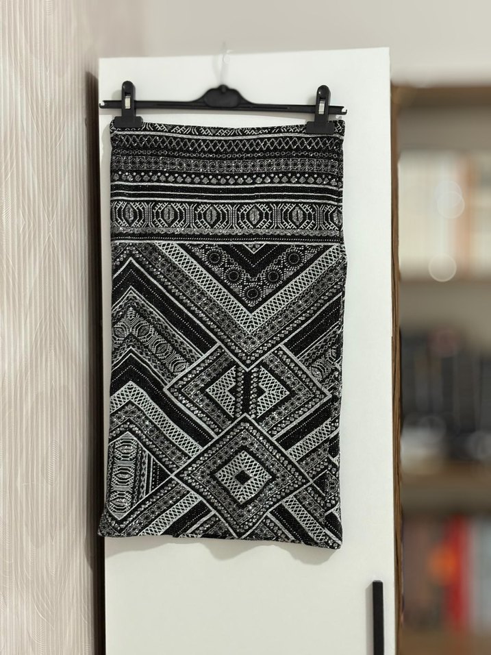 Siyah-beyaz bohem desenli, drapeli ve vücuda oturan uzun tekstil etek. Günlük kullanıma uygun koyu renkli desene sahip.